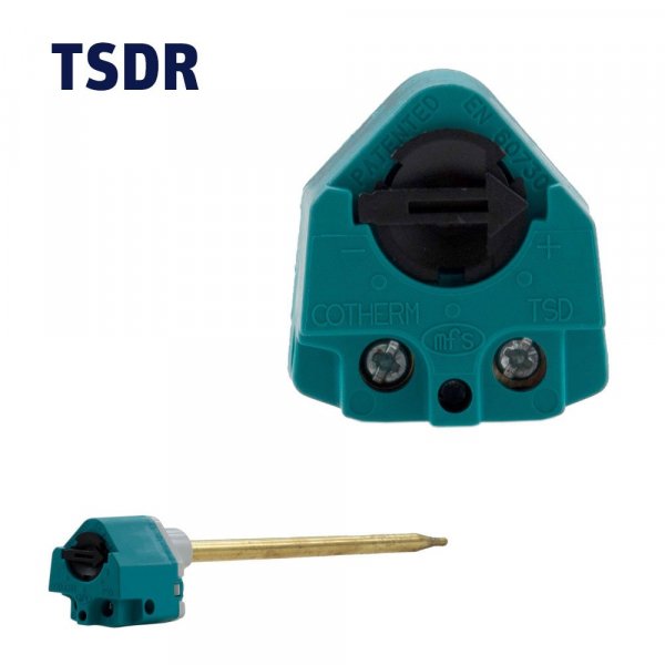 A Cotherm TSDR1103 is an adjustable control thermostat with a range of approximately 8°C – 65°C, with a safety cutout at 90°C.